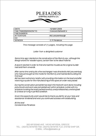 During the construction period Ad has kept informed with work done including pictures etc and work was completed well within schedule (unlike with my schedule building the boat) packed carefully and professionally and shipped to Greece arriving in perfect condition.